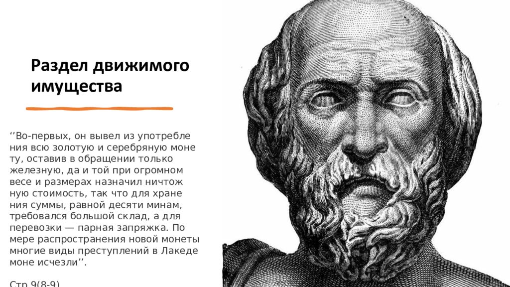 Раздел движимого имущества ‘’ Во-первых, он вывел из употребления всю золотую и серебряную монету, оставив в обращении только железную, да и той при огромном весе и размерах назначил ничтожную стоимость, так что для хранения суммы, равной десяти минам, требовался большой склад, а для перевозки — парная запряжка. По мере распространения новой монеты многие виды преступлений в Лакедемоне исчезли ’’. Стр 9 (8-9)