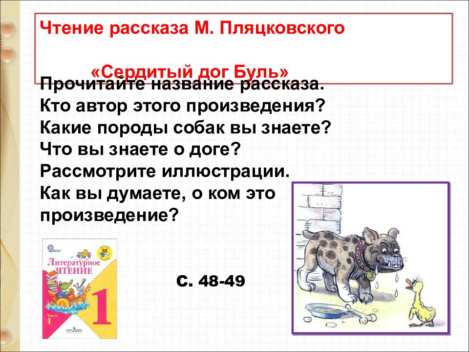 Чтение рассказа М. Пляцковского «Сердитый дог Буль» Прочитайте название рассказа. Кто автор этого произведения? Какие породы собак вы знаете? Что вы знаете о доге? Рассмотрите иллюстрации. Как вы думаете, о ком это произведение? С. 48-49