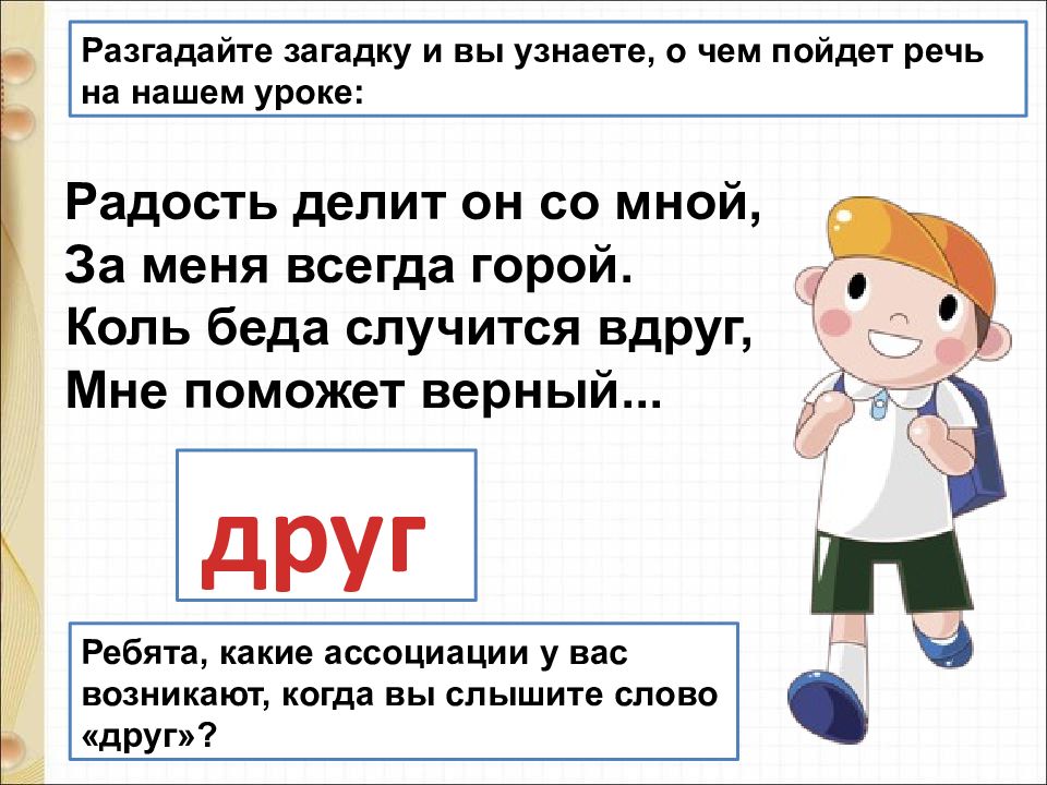 Разгадайте загадку и вы узнаете, о чем пойдет речь на нашем уроке: Радость делит он со мной, За меня всегда горой. Коль беда случится вдруг, Мне поможет верный... друг Ребята, какие ассоциации у вас возникают, когда вы слышите слово «друг»?