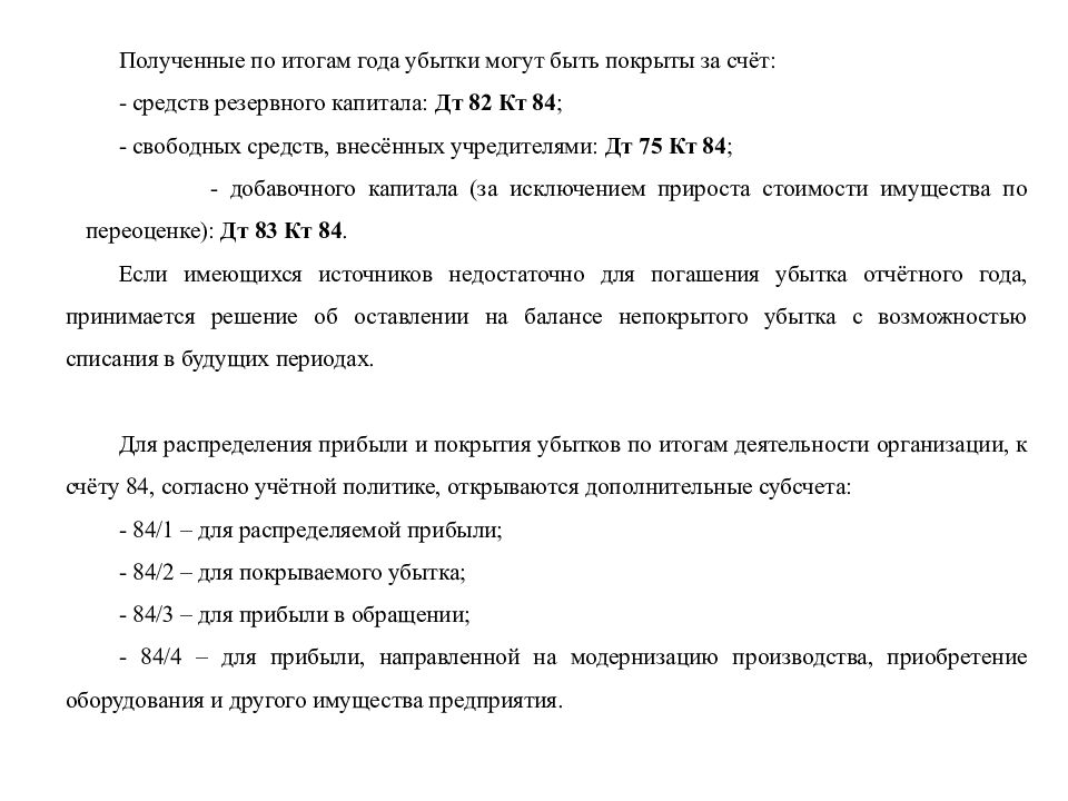 Полученные по итогам года убытки могут быть покрыты за счёт: - средств резервного капитала: Дт 82 Кт 84 ; - свободных средств, внесённых учредителями: Дт 75 Кт 84 ; - добавочного капитала (за исключением прироста стоимости имущества по переоценке): Дт 83 Кт 84. Если имеющихся источников недостаточно для погашения убытка отчётного года, принимается решение об оставлении на балансе непокрытого убытка с возможностью списания в будущих периодах. Для распределения прибыли и покрытия убытков по итогам деятельности организации, к счёту 84, согласно учётной политике, открываются дополнительные субсчета : - 84/1 – для распределяемой прибыли; - 84/2 – для покрываемого убытка; - 84/3 – для прибыли в обращении; - 84/4 – для прибыли, направленной на модернизацию производства, приобретение оборудования и другого имущества предприятия.