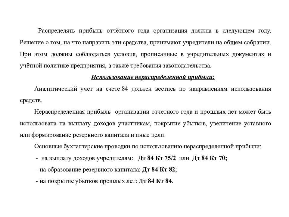 Распределять прибыль отчётного года организация должна в следующем году. Решение о том, на что направить эти средства, принимают учредители на общем собрании. При этом должны соблюдаться условия, прописанные в учредительных документах и учётной политике предприятия, а также требования законодательства. Использование нераспределенной прибыли: Аналитический учет на счете 84 должен вестись по направлениям использования средств. Нераспределенная прибыль организации отчетного года и прошлых лет может быть использована на выплату доходов участникам, покрытие убытков, увеличение уставного или формирование резервного капитала и иные цели. Основные бухгалтерские проводки по использованию нераспределенной прибыли: - на выплату доходов учредителям: Дт 84 Кт 75/2 или Дт 84 Кт 70; - на образование резервного капитала: Дт 84 Кт 82 ; - на покрытие убытков прошлых лет: Дт 84 Кт 84.