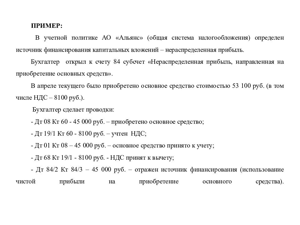 ПРИМЕР: В учетной политике АО «Альянс» (общая система налогообложения) определен источник финансирования капитальных вложений – нераспределенная прибыль. Бухгалтер открыл к счету 84 субсчет «Нераспределенная прибыль, направленная на приобретение основных средств». В апреле текущего было приобретено основное средство стоимостью 53 100 руб. (в том числе НДС – 8100 руб.). Бухгалтер сделает проводки: - Дт 08 Кт 60 - 45 000 руб. – приобретено основное средство; - Дт 19/1 Кт 60 - 8100 руб. – учтен НДС; - Дт 01 Кт 08 – 45 000 руб. – основное средство принято к учету; - Дт 68 Кт 19/1 - 8100 руб. - НДС принят к вычету; - Дт 84/2 Кт 84/3 – 45 000 руб. – отражен источник финансирования (использование чистой прибыли на приобретение основного средства).