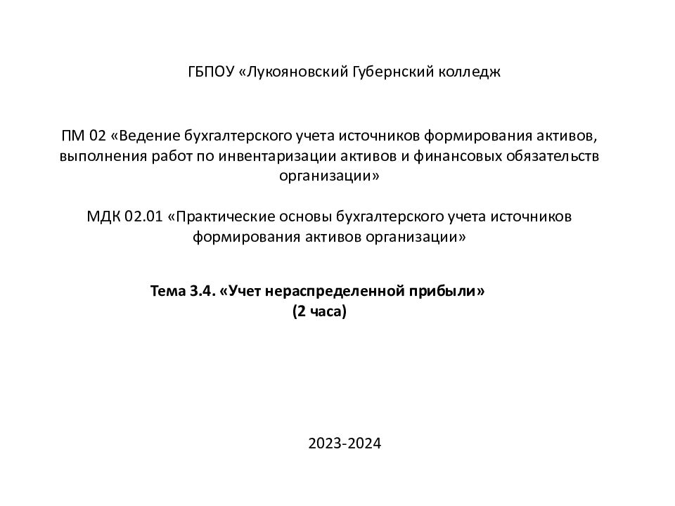 ПМ 02 «Ведение бухгалтерского учета источников формирования активов, выполнения работ по инвентаризации активов и финансовых обязательств организации» МДК 02.01 «Практические основы бухгалтерского учета источников формирования активов организации» ГБПОУ « Лукояновский Губернский колледж Тема 3.4. «Учет нераспределенной прибыли» ( 2 часа) 2023-2024
