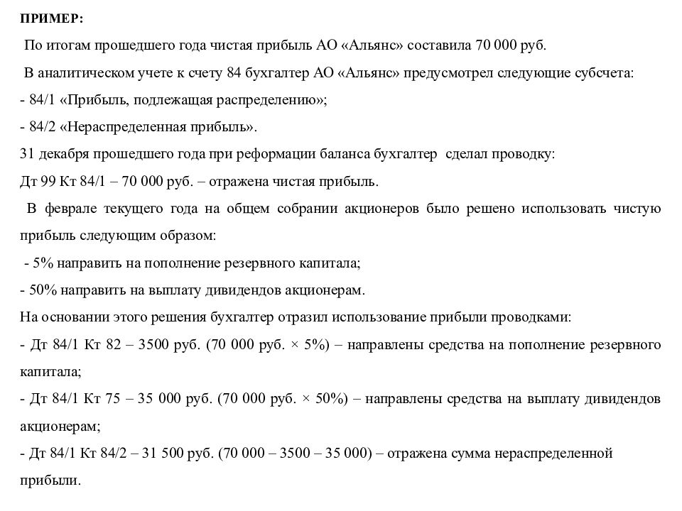 ПРИМЕР: По итогам прошедшего года чистая прибыль АО «Альянс» составила 70 000 руб. В аналитическом учете к счету 84 бухгалтер АО «Альянс» предусмотрел следующие субсчета : - 84/1 «Прибыль, подлежащая распределению»; - 84/2 «Нераспределенная прибыль». 31 декабря прошедшего года при реформации баланса бухгалтер сделал проводку: Дт 99 Кт 84/1 – 70 000 руб. – отражена чистая прибыль. В феврале текущего года на общем собрании акционеров было решено использовать чистую прибыль следующим образом: - 5% направить на пополнение резервного капитала; - 50% направить на выплату дивидендов акционерам. На основании этого решения бухгалтер отразил использование прибыли проводками: - Дт 84/1 Кт 82 – 3500 руб. (70 000 руб. × 5%) – направлены средства на пополнение резервного капитала; - Дт 84/1 Кт 75 – 35 000 руб. (70 000 руб. × 50%) – направлены средства на выплату дивидендов акционерам; - Дт 84/1 Кт 84/2 – 31 500 руб. (70 000 – 3500 – 35 000) – отражена сумма нераспределенной прибыли.
