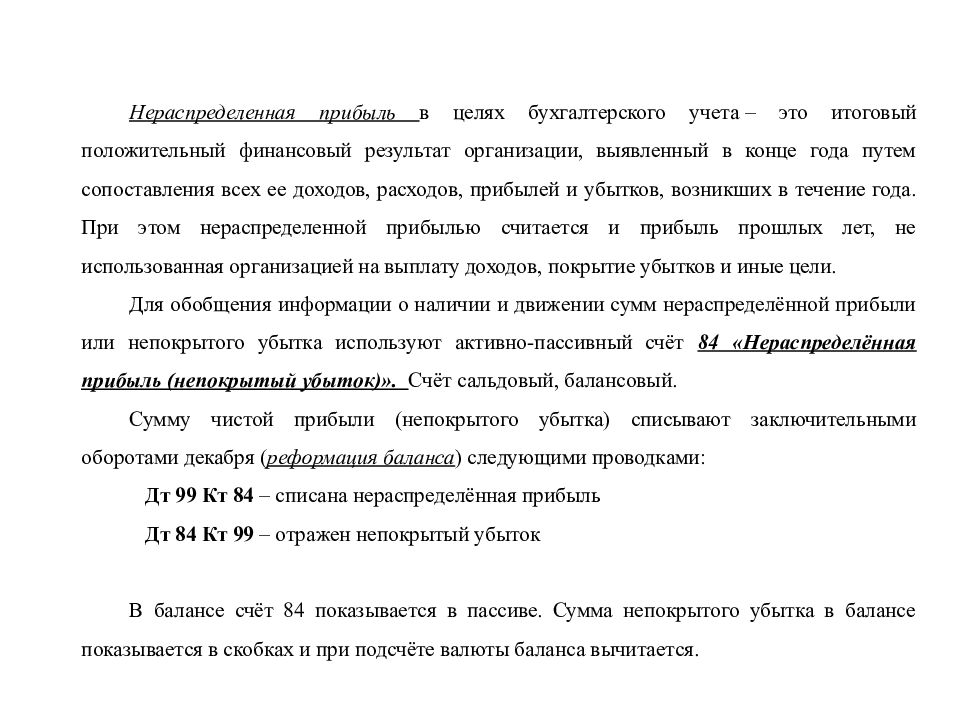 Нераспределенная прибыль в целях бухгалтерского учета – это итоговый положительный финансовый результат организации, выявленный в конце года путем сопоставления всех ее доходов, расходов, прибылей и убытков, возникших в течение года. При этом нераспределенной прибылью считается и прибыль прошлых лет, не использованная организацией на выплату доходов, покрытие убытков и иные цели. Для обобщения информации о наличии и движении сумм нераспределённой прибыли или непокрытого убытка используют активно-пассивный счёт 84 «Нераспределённая прибыль (непокрытый убыток)». Счёт сальдовый, балансовый. Сумму чистой прибыли (непокрытого убытка) списывают заключительными оборотами декабря ( реформация баланса ) следующими проводками: Дт 99 Кт 84 – списана нераспределённая прибыль Дт 84 Кт 99 – отражен непокрытый убыток В балансе счёт 84 показывается в пассиве. Сумма непокрытого убытка в балансе показывается в скобках и при подсчёте валюты баланса вычитается.