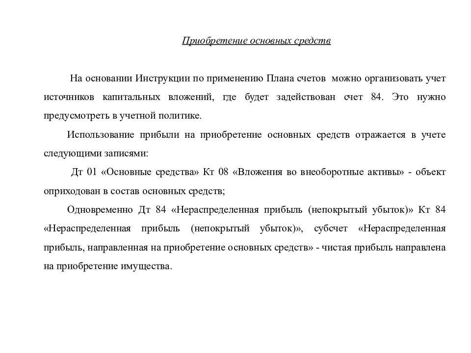 Приобретение основных средств На основании Инструкции по применению Плана счетов можно организовать учет источников капитальных вложений, где будет задействован счет 84. Это нужно предусмотреть в учетной политике. Использование прибыли на приобретение основных средств отражается в учете следующими записями: Дт 01 «Основные средства» Кт 08 «Вложения во внеоборотные активы» - объект оприходован в состав основных средств; Одновременно Дт 84 «Нераспределенная прибыль (непокрытый убыток)» Кт 84 «Нераспределенная прибыль (непокрытый убыток)», субсчет «Нераспределенная прибыль, направленная на приобретение основных средств» - чистая прибыль направлена на приобретение имущества.