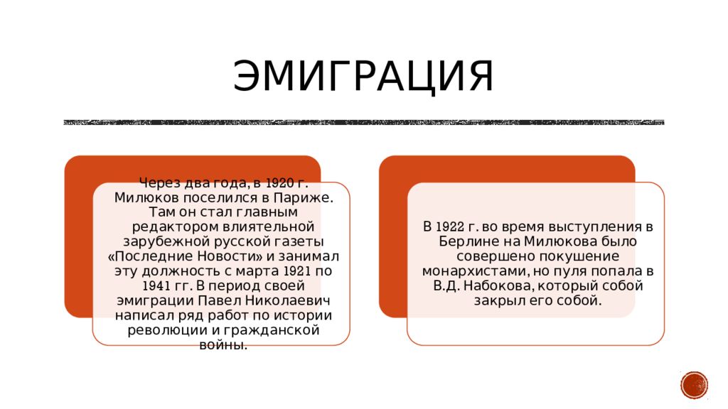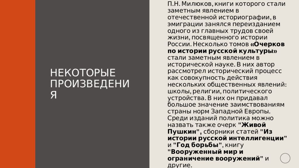 П.Н. Милюков, книги которого стали заметным явлением в отечественной историографии, в эмиграции занялся переизданием одного из главных трудов своей жизни, посвященного истории России. Несколько томов «Очерков по истории русской культуры» стали заметным явлением в исторической науке. В них автор рассмотрел исторический процесс как совокупность действия нескольких общественных явлений: школы, религии, политического устройства. В них он придавал большое значение заимствованиям страны норм Западной Европы. Среди изданий политика можно назвать также очерк "Живой Пушкин", сборники статей "Из истории русской интеллигенции" и "Год борьбы", книгу "Вооруженный мир и ограничение вооружений" и другие.