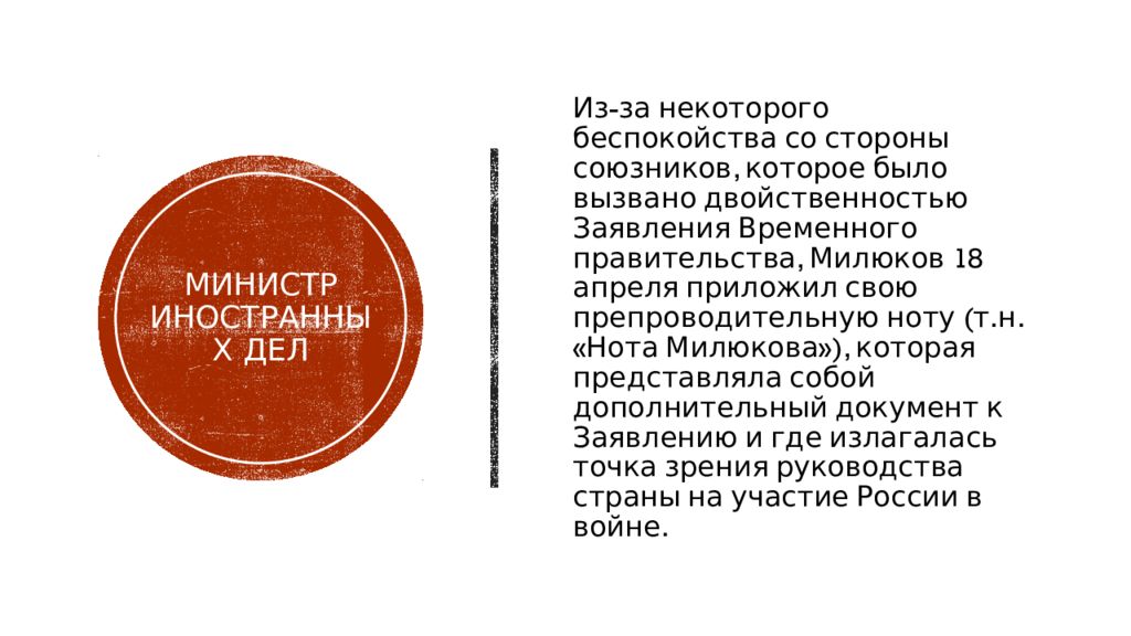 Из-за некоторого беспокойства со стороны союзников, которое было вызвано двойственностью Заявления Временного правительства, Милюков 18 апреля приложил свою препроводительную ноту (т.н. «Нота Милюкова»), которая представляла собой дополнительный документ к Заявлению и где излагалась точка зрения руководства страны на участие России в войне.