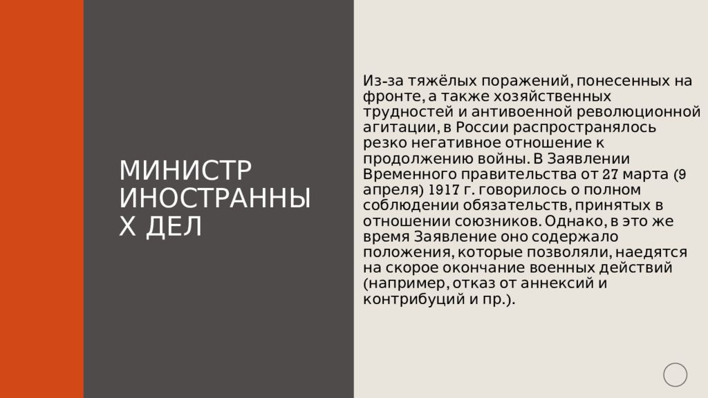 Из-за тяжёлых поражений, понесенных на фронте, а также хозяйственных трудностей и антивоенной революционной агитации, в России распространялось резко негативное отношение к продолжению войны. В Заявлении Временного правительства от 27 марта (9 апреля) 1917 г. говорилось о полном соблюдении обязательств, принятых в отношении союзников. Однако, в это же время Заявление оно содержало положения, которые позволяли, наедятся на скорое окончание военных действий (например, отказ от аннексий и контрибуций и пр.).