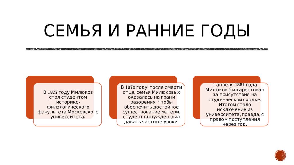 Павел Николаевич Милюков родился 15 (27) января 1859 года в Москве. Был старшим из двух родившихся в браке детей. Отец будущего политика — Николай Павлович Милюков — выпускник Академии художеств, архитектор по специальности. Мать гордилась принадлежностью к дворянскому роду Султановых. С ранних лет возник устойчивый интерес к поэзии и музыке. Рано начал писать стихи: вначале это были подражания Никитину, Пушкину, позднее - свои оригинальные произведения. Любовь к музыке пронес через всю жизнь: имел абсолютный музыкальный слух, прекрасно играл на скрипке.