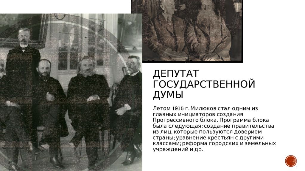 Летом 1915 г. Милюков стал одним из главных инициаторов создания Прогрессивного блока. Программа блока была следующая: создание правительства из лиц, которые пользуются доверием страны; уравнение крестьян с другими классами; реформа городских и земельных учреждений и др.