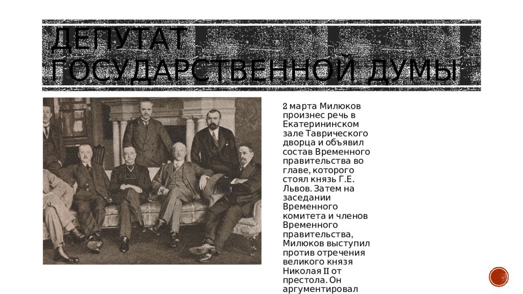 2 марта Милюков произнес речь в Екатерининском зале Таврического дворца и объявил состав Временного правительства во главе, которого стоял князь Г.Е. Львов. Затем на заседании Временного комитета и членов Временного правительства, Милюков выступил против отречения великого князя Николая II от престола. Он аргументировал свою позицию тем, что сильная власть, необходимая для укрепления нового порядка, но так же она нуждается в опоре символа власти, к которому массы уже привыкли. Однако, подобные высказывания не нашли поддержки у большинства лидеров Прогрессивного блока.