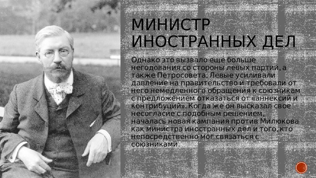 Однако это вызвало еще больше негодования со стороны левых партий, а также Петросовета. Левые усиливали давление на правительство и требовали от него немедленного обращения к союзникам с предложением отказаться от «аннексий и контрибуций». Когда же он высказал свое несогласие с подобным решением, началась новая кампания против Милюкова как министра иностранных дел и того, кто непосредственно мог связаться с союзниками.