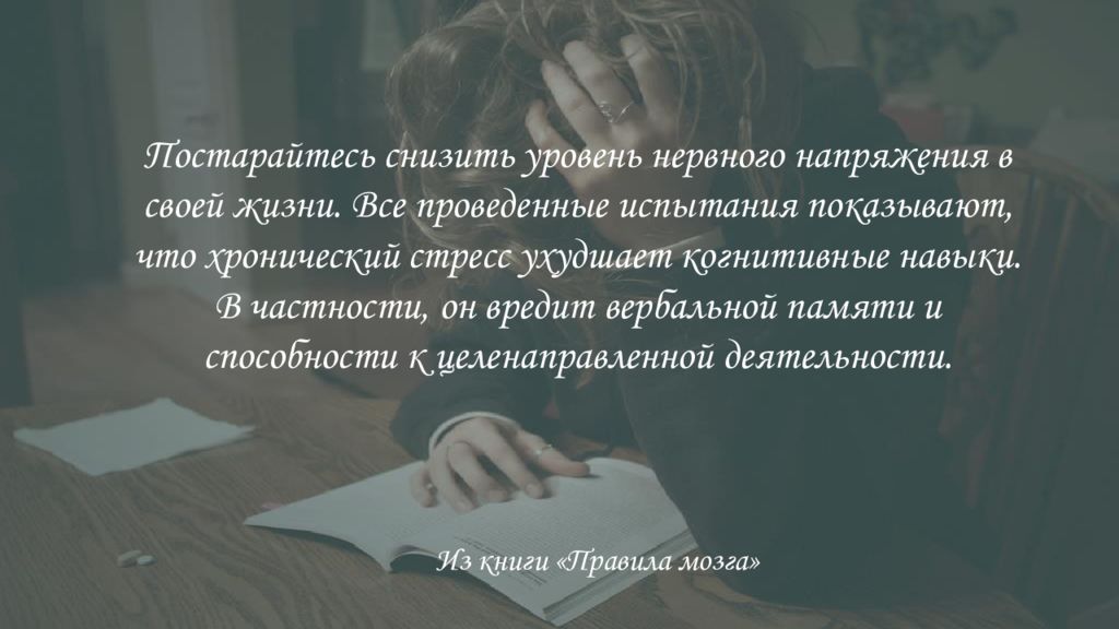 Постарайтесь снизить уровень нервного напряжения в своей жизни. Все проведенные испытания показывают, что хронический стресс ухудшает когнитивные навыки. В частности, он вредит вербальной памяти и способности к целенаправленной деятельности. Из книги «Правила мозга»