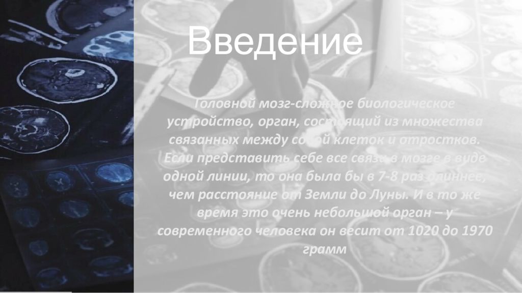 Головной мозг-сложное биологическое устройство, орган, состоящий из множества связанных между собой клеток и отростков. Если представить себе все связи в мозге в виде одной линии, то она была бы в 7-8 раз длиннее, чем расстояние от Земли до Луны. И в то же время это очень небольшой орган – у современного человека он весит от 1020 до 1970 грамм Введение