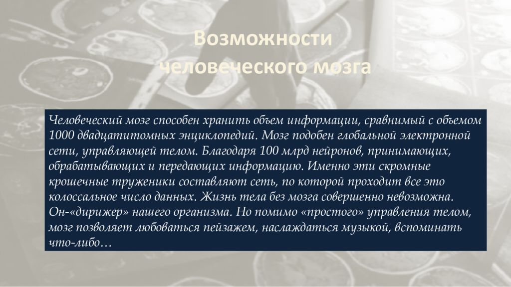 Человеческий мозг способен хранить объем информации, сравнимый с объемом 1000 двадцатитомных энциклопедий. Мозг подобен глобальной электронной сети, управляющей телом. Благодаря 100 млрд нейронов, принимающих, обрабатывающих и передающих информацию. Именно эти скромные крошечные труженики составляют сеть, по которой проходит все это колоссальное число данных. Жизнь тела без мозга совершенно невозможна. Он-« дирижер» нашего организма. Но помимо «простого» управления телом, мозг позволяет любоваться пейзажем, наслаждаться музыкой, вспоминать что-либо… Возможности человеческого мозга