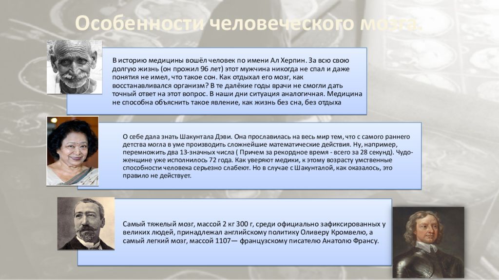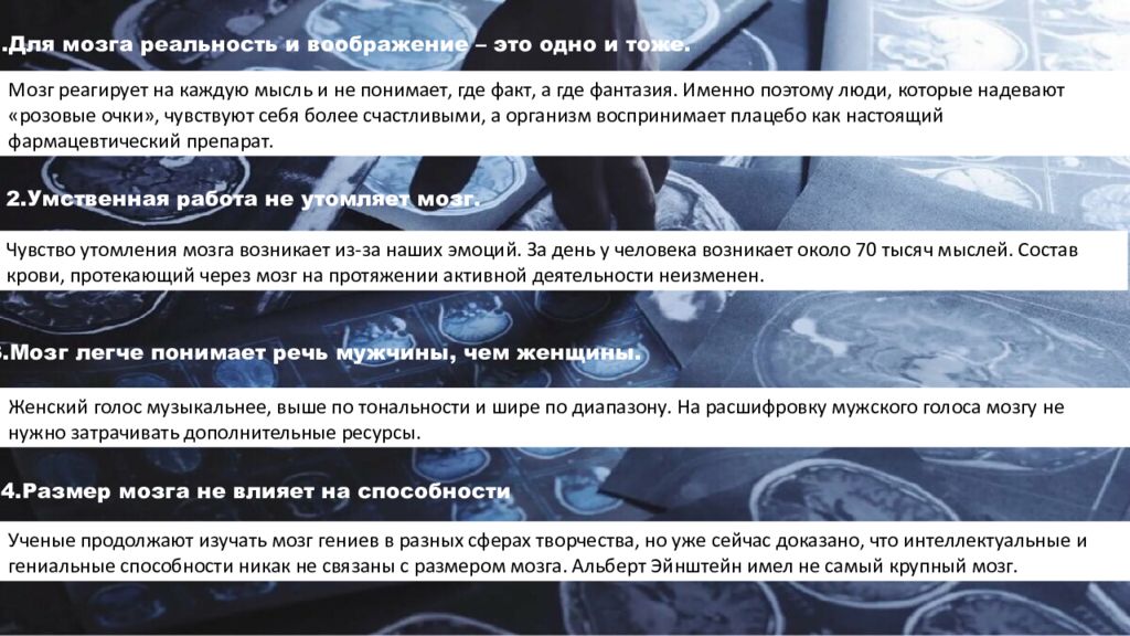 1.Для мозга реальность и воображение – это одно и тоже. Мозг реагирует на каждую мысль и не понимает, где факт, а где фантазия. Именно поэтому люди, которые надевают «розовые очки», чувствуют себя более счастливыми, а организм воспринимает плацебо как настоящий фармацевтический препарат. 2.Умственная работа не утомляет мозг. Чувство утомления мозга возникает из-за наших эмоций. За день у человека возникает около 70 тысяч мыслей. Состав крови, протекающий через мозг на протяжении активной деятельности неизменен. 3.Мозг легче понимает речь мужчины, чем женщины. Женский голос музыкальнее, выше по тональности и шире по диапазону. На расшифровку мужского голоса мозгу не нужно затрачивать дополнительные ресурсы. 4.Размер мозга не влияет на способности Ученые продолжают изучать мозг гениев в разных сферах творчества, но уже сейчас доказано, что интеллектуальные и гениальные способности никак не связаны с размером мозга. Альберт Эйнштейн имел не самый крупный мозг.