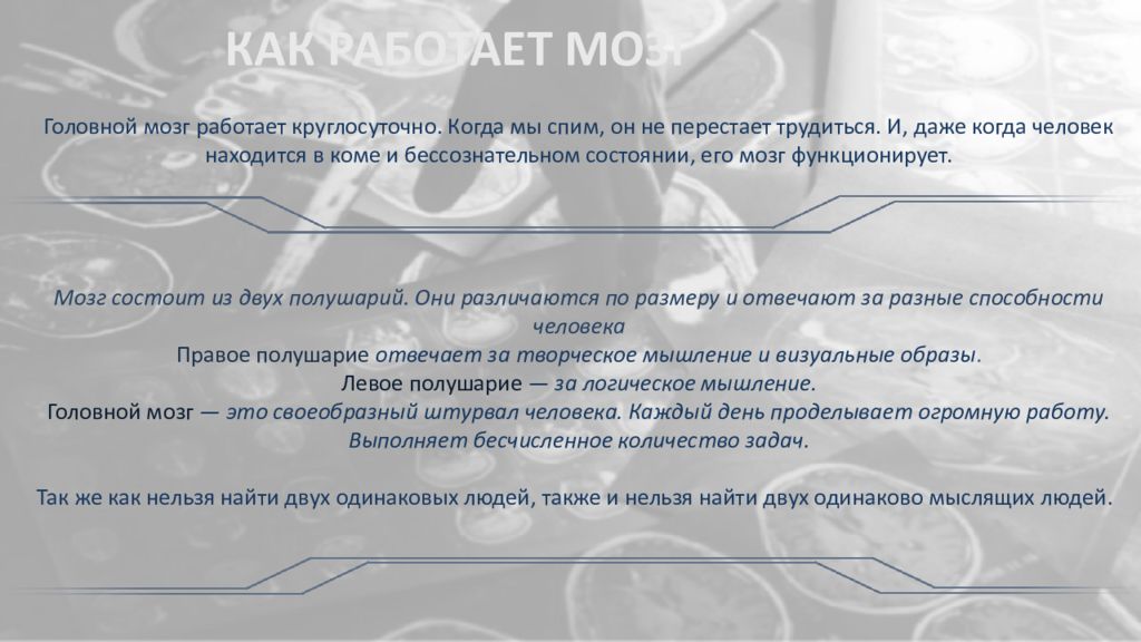 КАК РАБОТАЕТ МОЗГ Головной мозг работает круглосуточно. Когда мы спим, он не перестает трудиться. И, даже когда человек находится в коме и бессознательном состоянии, его мозг функционирует. Мозг состоит из двух полушарий. Они различаются по размеру и отвечают за разные способности человека Правое полушарие отвечает за творческое мышление и визуальные образы. Левое полушарие — за логическое мышление. Головной мозг — это своеобразный штурвал человека. Каждый день проделывает огромную работу. Выполняет бесчисленное количество задач. Так же как нельзя найти двух одинаковых людей, также и нельзя найти двух одинаково мыслящих людей.