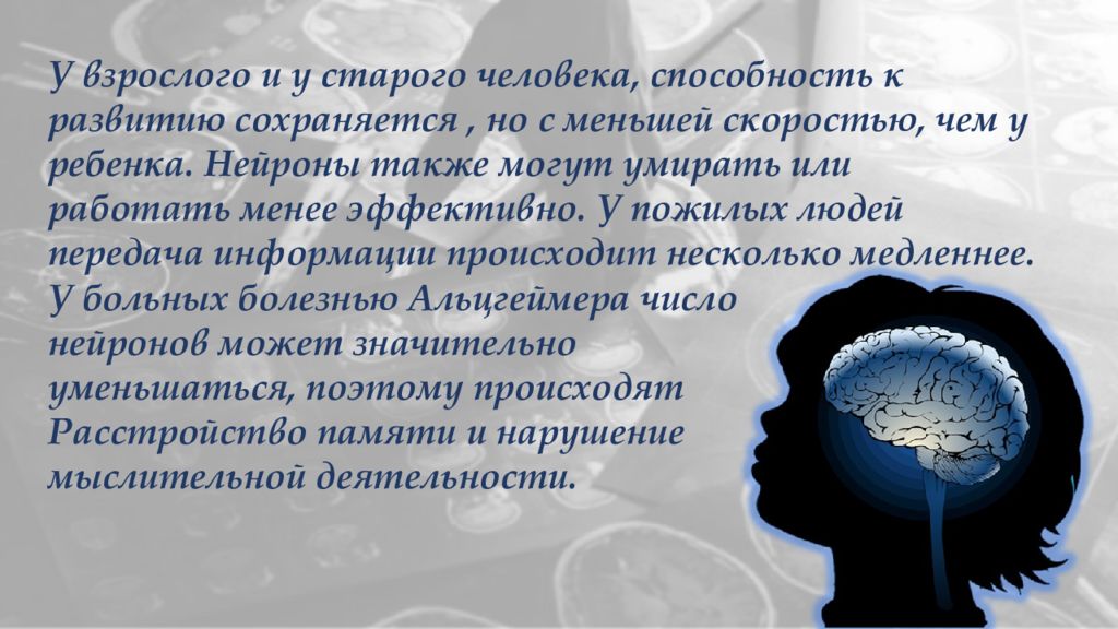 У взрослого и у старого человека, способность к развитию сохраняется, но с меньшей скоростью, чем у ребенка. Нейроны также могут умирать или работать менее эффективно. У пожилых людей передача информации происходит несколько медленнее. У больных болезнью Альцгеймера число нейронов может значительно уменьшаться, поэтому происходят Расстройство памяти и нарушение мыслительной деятельности.