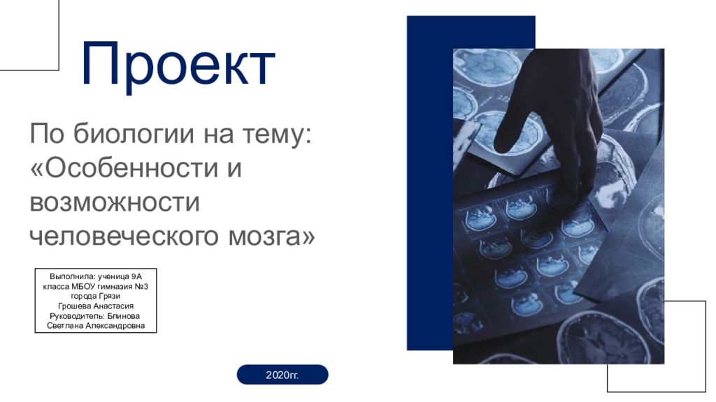 По биологии на тему: «Особенности и возможности человеческого мозга» Выполнила: ученица 9А класса МБОУ гимназия №3 города Грязи Грошева Анастасия Руководитель: Блинова Светлана Александровна Проект 2020 г г.