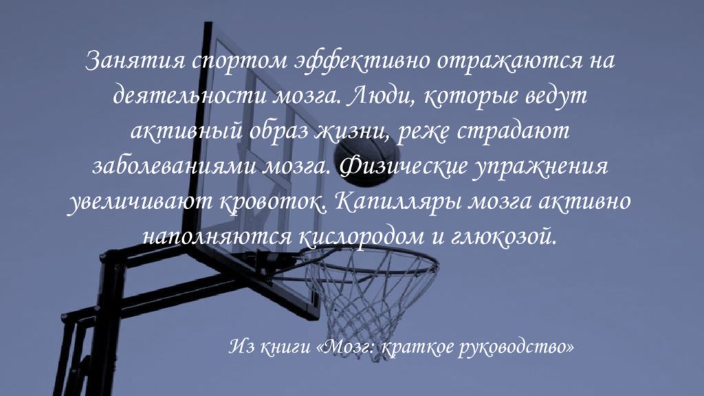 Занятия спортом эффективно отражаются на деятельности мозга. Люди, которые ведут активный образ жизни, реже страдают заболеваниями мозга. Физические упражнения увеличивают кровоток. Капилляры мозга активно наполняются кислородом и глюкозой. Из книги «Мозг: краткое руководство»