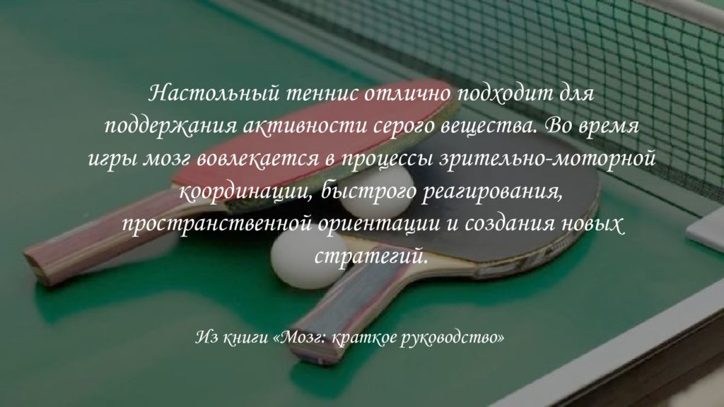 Настольный теннис отлично подходит для поддержания активности серого вещества. Во время игры мозг вовлекается в процессы зрительно-моторной координации, быстрого реагирования, пространственной ориентации и создания новых стратегий. Из книги «Мозг: краткое руководство»