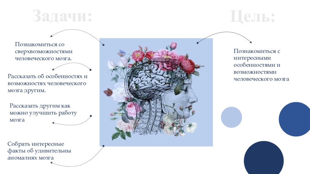 Цель: Задачи: Собрать интересные факты об удивительны аномалиях мозга Рассказать другим как можно улучшить работу мозга Познакомиться со сверхвозможностями человеческого мозга. Рассказать об особенностях и возможностях человеческого мозга другим. Познакомиться с интересными особенностями и возможностями человеческого мозга