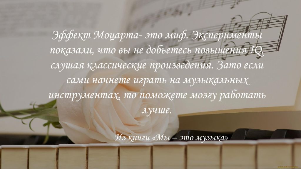 Эффект Моцарта- это миф. Эксперименты показали, что вы не добьетесь повышения IQ, слушая классические произведения. Зато если сами начнете играть на музыкальных инструментах, то поможете мозгу работать лучше. Из книги «Мы – это музыка»