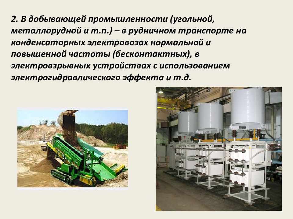 2. В добывающей промышленности (угольной, металлорудной и т.п.) – в рудничном транспорте на конденсаторных электровозах нормальной и повышенной частоты (бесконтактных), в электровзрывных устройствах с использованием электрогидравлического эффекта и т.д.