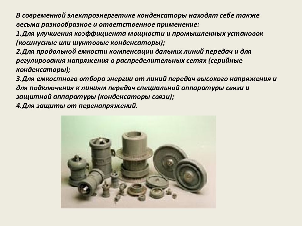 В современной электроэнергетике конденсаторы находят себе также весьма разнообразное и ответственное применение: 1. Для улучшения коэффициента мощности и промышленных установок (косинусные или шунтовые конденсаторы); 2.Для продольной емкости компенсации дальних линий передач и для регулирования напряжения в распределительных сетях (серийные конденсаторы); 3.Для емкостного отбора энергии от линий передач высокого напряжения и для подключения к линиям передач специальной аппаратуры связи и защитной аппаратуры (конденсаторы связи); 4.Для защиты от перенапряжений.