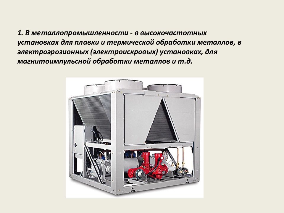 1. В металлопромышленности - в высокочастотных установках для плавки и термической обработки металлов, в электроэрозионных (электроискровых) установках, для магнитоимпульсной обработки металлов и т.д.