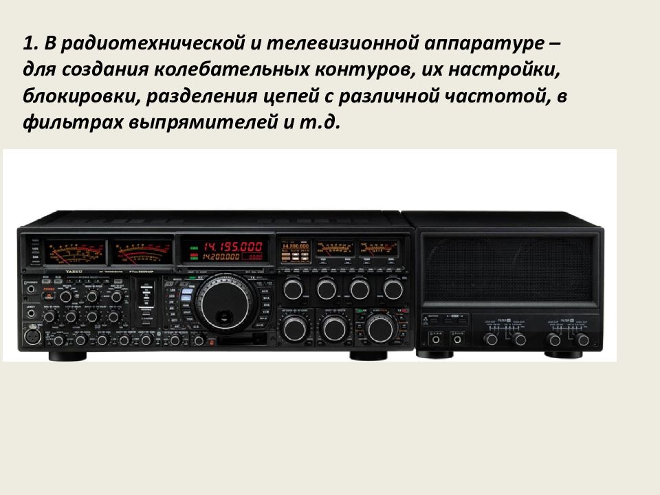 1. В радиотехнической и телевизионной аппаратуре – для создания колебательных контуров, их настройки, блокировки, разделения цепей с различной частотой, в фильтрах выпрямителей и т.д.