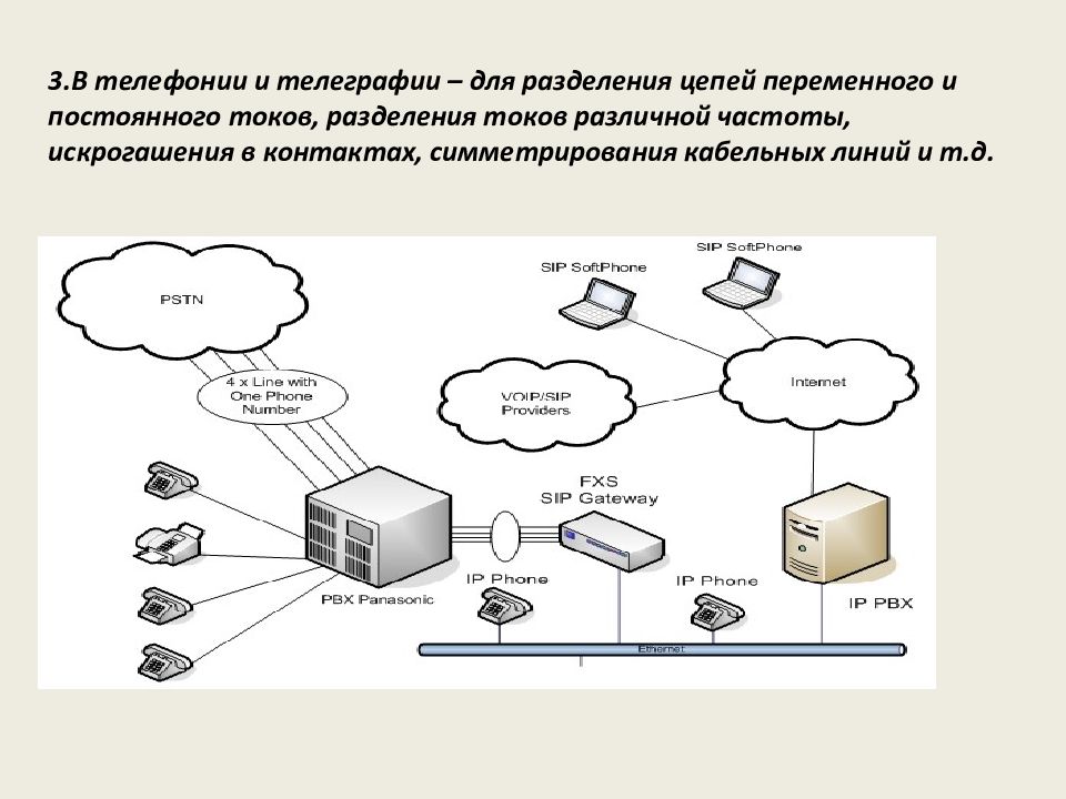 3.В телефонии и телеграфии – для разделения цепей переменного и постоянного токов, разделения токов различной частоты, искрогашения в контактах, симметрирования кабельных линий и т.д.