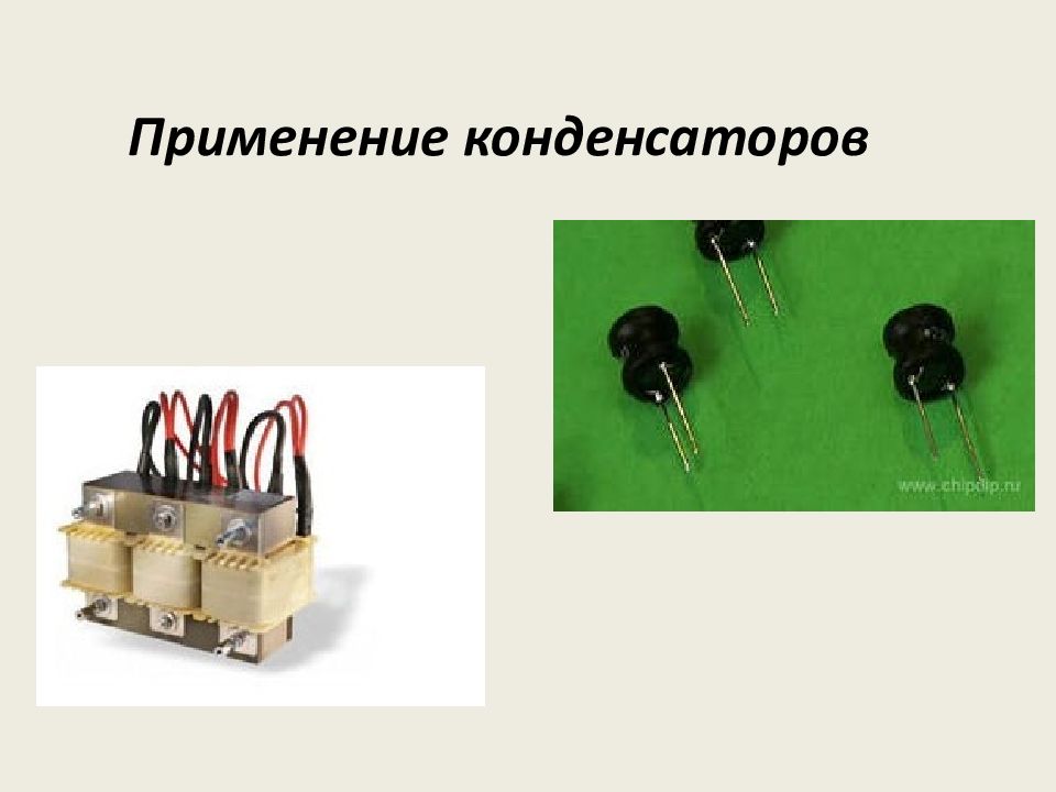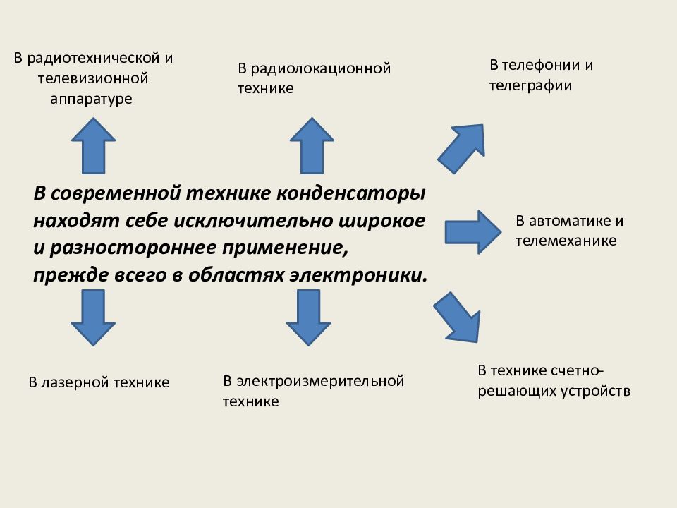 В современной технике конденсаторы находят себе исключительно широкое и разностороннее применение, прежде всего в областях электроники. В радиотехнической и телевизионной аппаратуре В радиолокационной технике В телефонии и телеграфии В автоматике и телемеханике В технике счетно-решающих устройств В электроизмерительной технике В лазерной технике