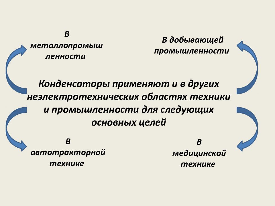 Конденсаторы применяют и в других неэлектротехнических областях техники и промышленности для следующих основных целей В металлопромышленности В добывающей промышленности В автотракторной технике В медицинской технике