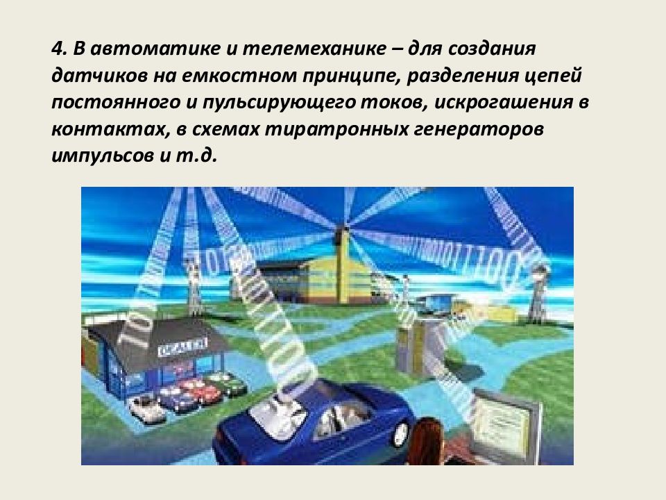 4. В автоматике и телемеханике – для создания датчиков на емкостном принципе, разделения цепей постоянного и пульсирующего токов, искрогашения в контактах, в схемах тиратронных генераторов импульсов и т.д.