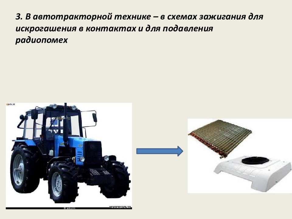 3. В автотракторной технике – в схемах зажигания для искрогашения в контактах и для подавления радиопомех