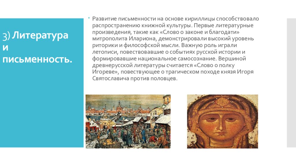 Развитие письменности на основе кириллицы способствовало распространению книжной культуры. Первые литературные произведения, такие как «Слово о законе и благодати» митрополита Илариона, демонстрировали высокий уровень риторики и философской мысли. Важную роль играли летописи, повествовавшие о событиях русской истории и формировавшие национальное самосознание. Вершиной древнерусской литературы считается «Слово о полку Игореве», повествующее о трагическом походе князя Игоря Святославича против половцев.