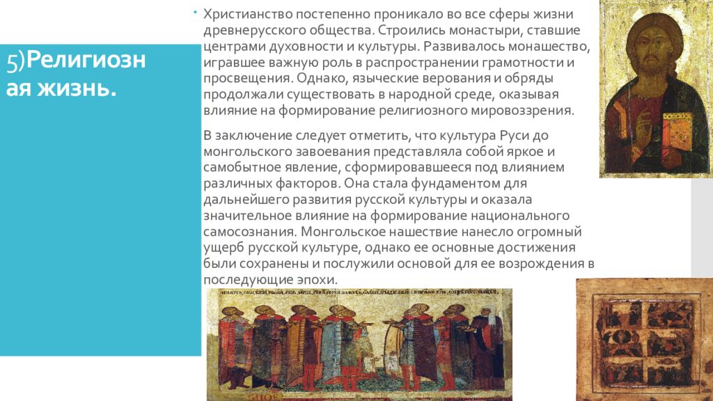 Христианство постепенно проникало во все сферы жизни древнерусского общества. Строились монастыри, ставшие центрами духовности и культуры. Развивалось монашество, игравшее важную роль в распространении грамотности и просвещения. Однако, языческие верования и обряды продолжали существовать в народной среде, оказывая влияние на формирование религиозного мировоззрения. В заключение следует отметить, что культура Руси до монгольского завоевания представляла собой яркое и самобытное явление, сформировавшееся под влиянием различных факторов. Она стала фундаментом для дальнейшего развития русской культуры и оказала значительное влияние на формирование национального самосознания. Монгольское нашествие нанесло огромный ущерб русской культуре, однако ее основные достижения были сохранены и послужили основой для ее возрождения в последующие эпохи.