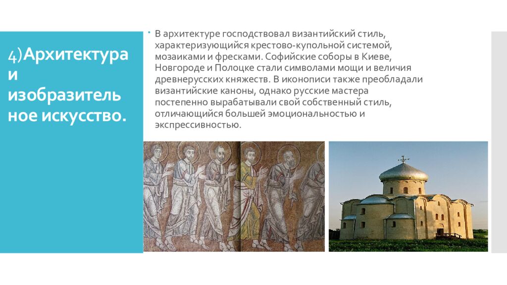В архитектуре господствовал византийский стиль, характеризующийся крестово-купольной системой, мозаиками и фресками. Софийские соборы в Киеве, Новгороде и Полоцке стали символами мощи и величия древнерусских княжеств. В иконописи также преобладали византийские каноны, однако русские мастера постепенно вырабатывали свой собственный стиль, отличающийся большей эмоциональностью и экспрессивностью.