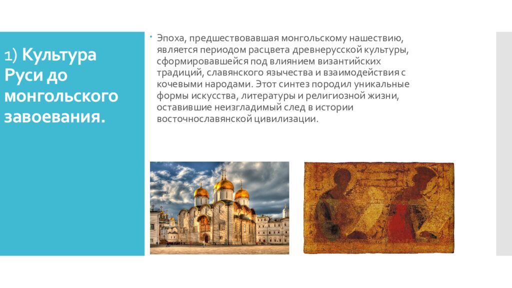 Эпоха, предшествовавшая монгольскому нашествию, является периодом расцвета древнерусской культуры, сформировавшейся под влиянием византийских традиций, славянского язычества и взаимодействия с кочевыми народами. Этот синтез породил уникальные формы искусства, литературы и религиозной жизни, оставившие неизгладимый след в истории восточнославянской цивилизации.