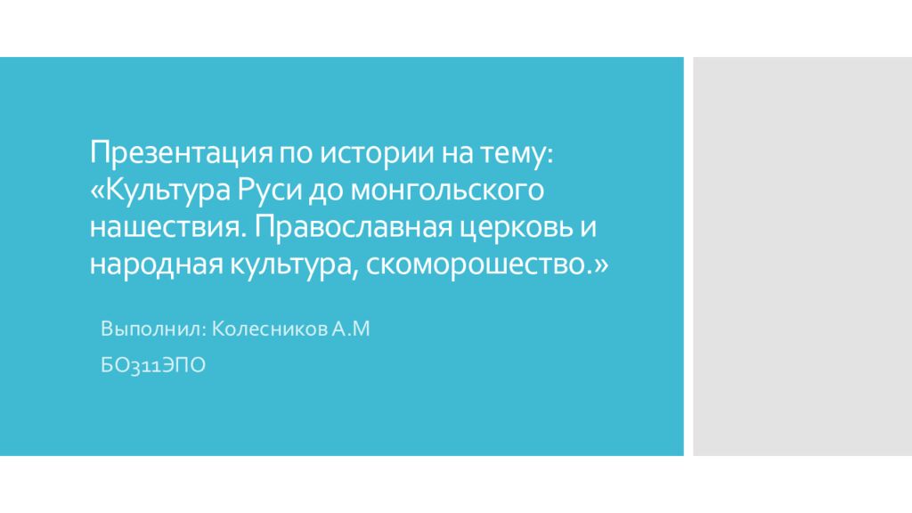 Первый слайд презентации: Презентация по истории на тему: «Культура Руси до монгольского нашествия. Православная церковь и народная культура, скоморошество.»