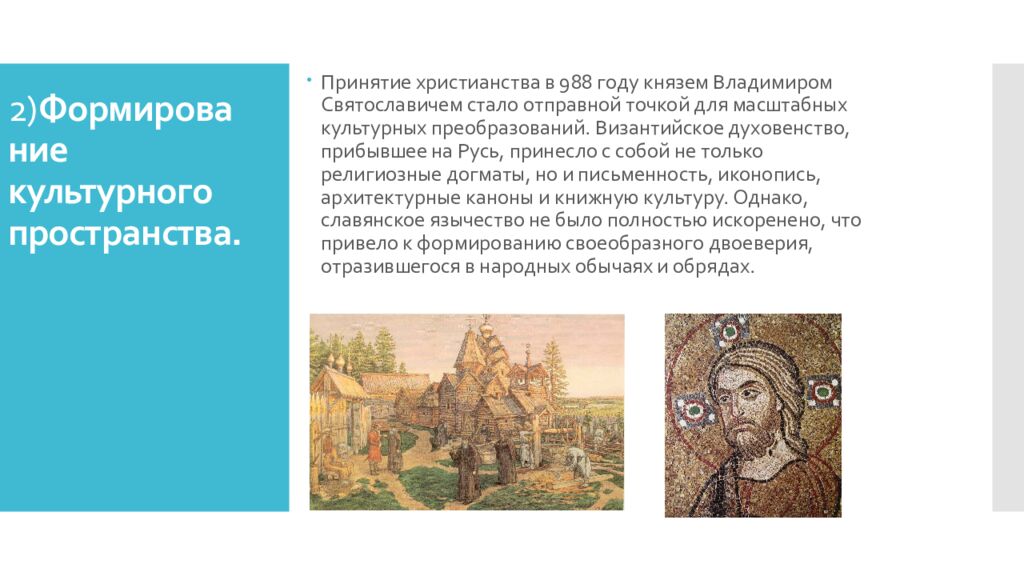 Принятие христианства в 988 году князем Владимиром Святославичем стало отправной точкой для масштабных культурных преобразований. Византийское духовенство, прибывшее на Русь, принесло с собой не только религиозные догматы, но и письменность, иконопись, архитектурные каноны и книжную культуру. Однако, славянское язычество не было полностью искоренено, что привело к формированию своеобразного двоеверия, отразившегося в народных обычаях и обрядах.
