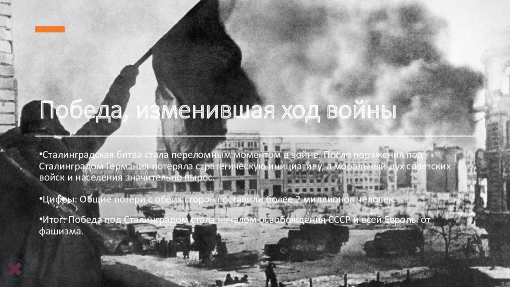 Победа, изменившая ход войны Сталинградская битва стала переломным моментом в войне. После поражения под Сталинградом Германия потеряла стратегическую инициативу, а моральный дух советских войск и населения значительно вырос. Цифры: Общие потери с обеих сторон составили более 2 миллионов человек. Итог: Победа под Сталинградом стала началом освобождения СССР и всей Европы от фашизма.