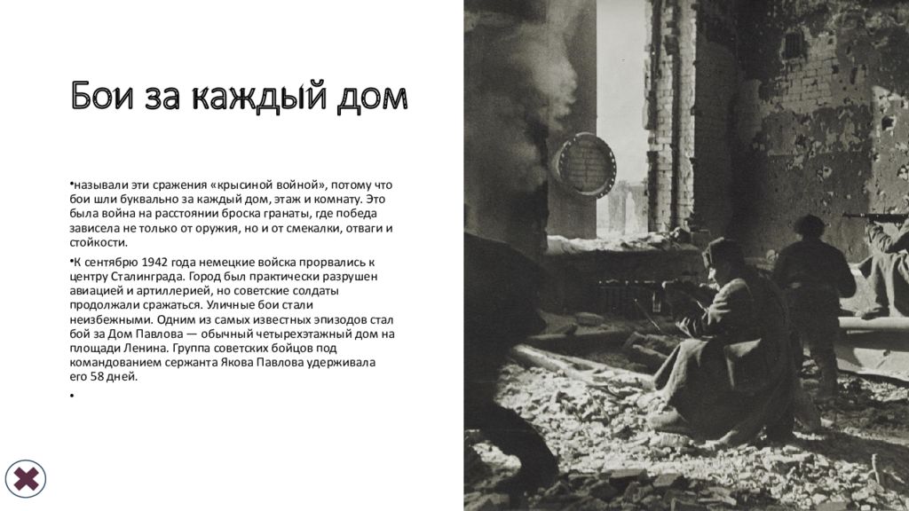 Бои за каждый дом называли эти сражения « крысиной войной », потому что бои шли буквально за каждый дом, этаж и комнату. Это была война на расстоянии броска гранаты, где победа зависела не только от оружия, но и от смекалки, отваги и стойкости. К сентябрю 1942 года немецкие войска прорвались к центру Сталинграда. Город был практически разрушен авиацией и артиллерией, но советские солдаты продолжали сражаться. Уличные бои стали неизбежными. Одним из самых известных эпизодов стал бой за Дом Павлова — обычный четырехэтажный дом на площади Ленина. Группа советских бойцов под командованием сержанта Якова Павлова удерживала его 58 дней.