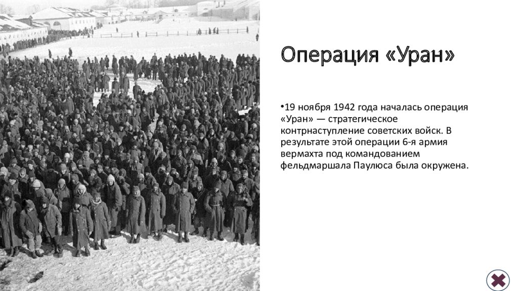 Операция «Уран» 19 ноября 1942 года началась операция «Уран» — стратегическое контрнаступление советских войск. В результате этой операции 6-я армия вермахта под командованием фельдмаршала Паулюса была окружена.