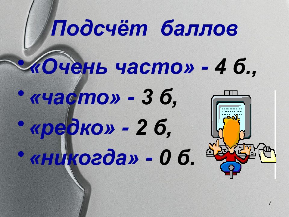 7 Подсчёт баллов «Очень часто» - 4 б., «часто» - 3 б, «редко» - 2 б, «никогда» - 0 б.
