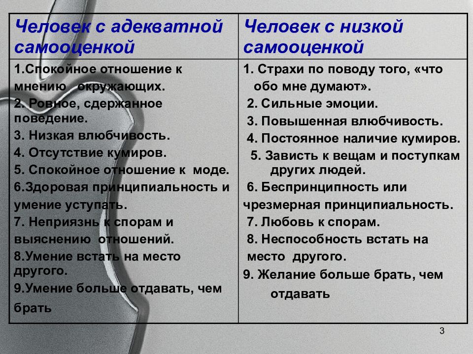 3 Человек с адекватной самооценкой Человек с низкой самооценкой 1.Спокойное отношение к мнению окружающих. 2. Ровное, сдержанное поведение. 3. Низкая влюбчивость. 4. Отсутствие кумиров. 5. Спокойное отношение к моде. 6.Здоровая принципиальность и умение уступать. 7. Неприязнь к спорам и выяснению отношений. 8.Умение встать на место другого. 9.Умение больше отдавать, чем брать 1. Страхи по поводу того, «что обо мне думают». 2. Сильные эмоции. 3. Повышенная влюбчивость. 4. Постоянное наличие кумиров. 5. Зависть к вещам и поступкам других людей. 6. Беспринципность или чрезмерная принципиальность. 7. Любовь к спорам. 8. Неспособность встать на место другого. 9. Желание больше брать, чем отдавать