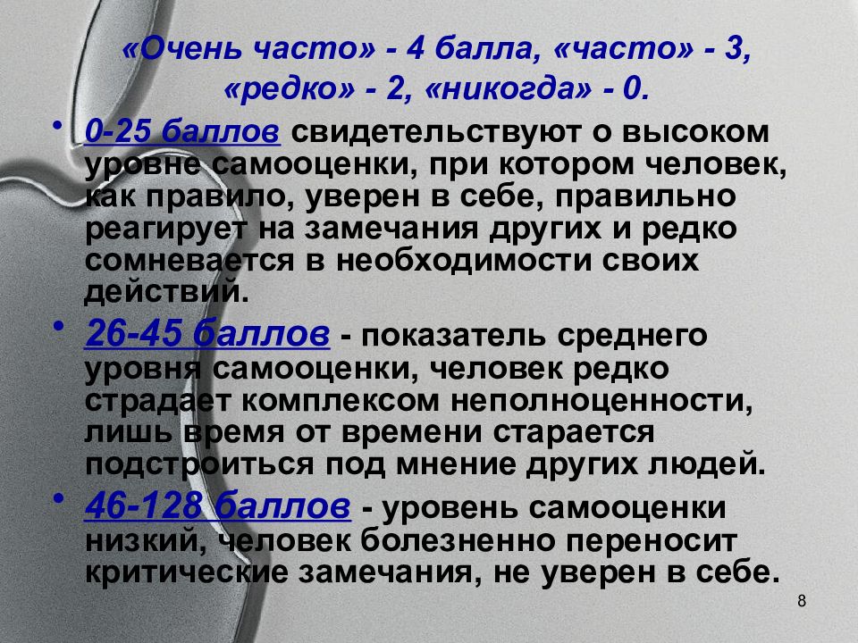 8 «Очень часто» - 4 балла, «часто» - 3, «редко» - 2, «никогда» - 0. 0-25 баллов свидетельствуют о высоком уровне самооценки, при котором человек, как правило, уверен в себе, правильно реагирует на замечания других и редко сомневается в необходимости своих действий. 26-45 баллов - показатель среднего уровня самооценки, человек редко страдает комплексом неполноценности, лишь время от времени старается подстроиться под мнение других людей. 46-128 баллов - уровень самооценки низкий, человек болезненно переносит критические замечания, не уверен в себе.