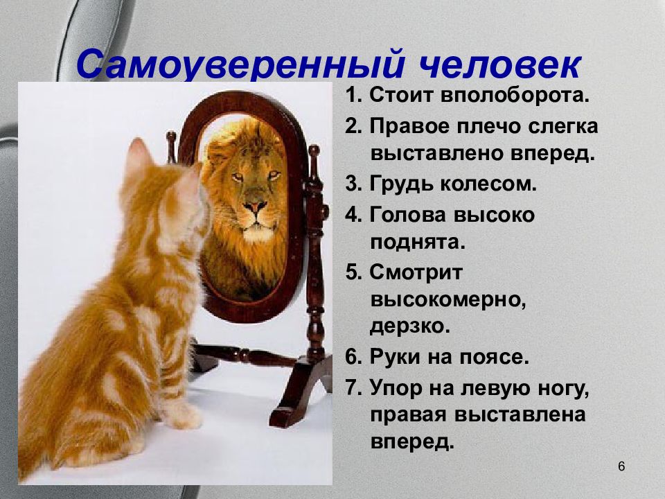 5 Уверенный в себе человек 1. Смотрит окружающим в глаза. 2. Голову держит прямо и даже чуть приподнимает подбородок. 3. Спина у него прямая, плечи развернуты. 4. Руки могут быть убраны за спину. 5. Ноги на ширине плеч и расслаблены